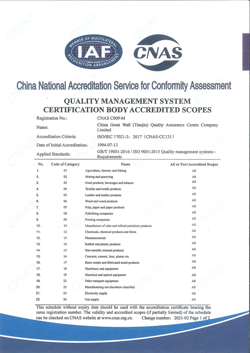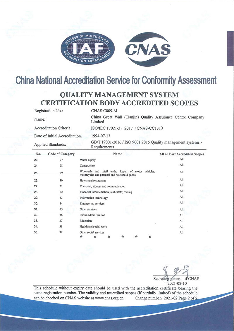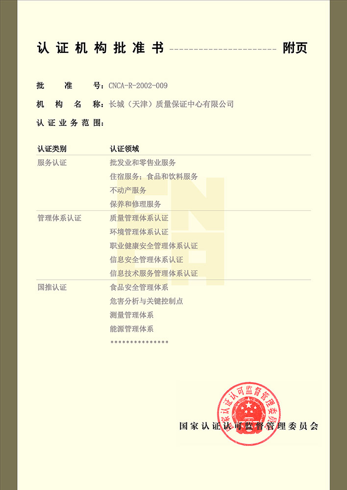 長城(天津)質(zhì)量保證中心有限公司(簡稱“長城中心”),出資人為天津國興資本運營有限公司,是國有法人獨資企業(yè)。長城中心是經(jīng)國家認(rèn)證認(rèn)可監(jiān)督管理委員會批準(zhǔn)認(rèn)證資格、經(jīng)中國合格評定國家認(rèn)可委員會批準(zhǔn)CNAS認(rèn)可資格的具有獨立法人資格的第三方認(rèn)證機構(gòu),是中國認(rèn)證認(rèn)可協(xié)會的常務(wù)理事單位。 長城中心1993年首批獲得國家認(rèn)可并批準(zhǔn)注冊,具備國際認(rèn)證認(rèn)可論壇IAF國際互認(rèn)資格,現(xiàn)已發(fā)展為遍涉全國認(rèn)證業(yè)務(wù)的大型綜合性認(rèn)證機構(gòu)之一。 長城中心具有質(zhì)量管理體系、環(huán)境管理體系、職業(yè)健康安全管理體系、食品安全管理體系、危害分析 [查看詳情]
