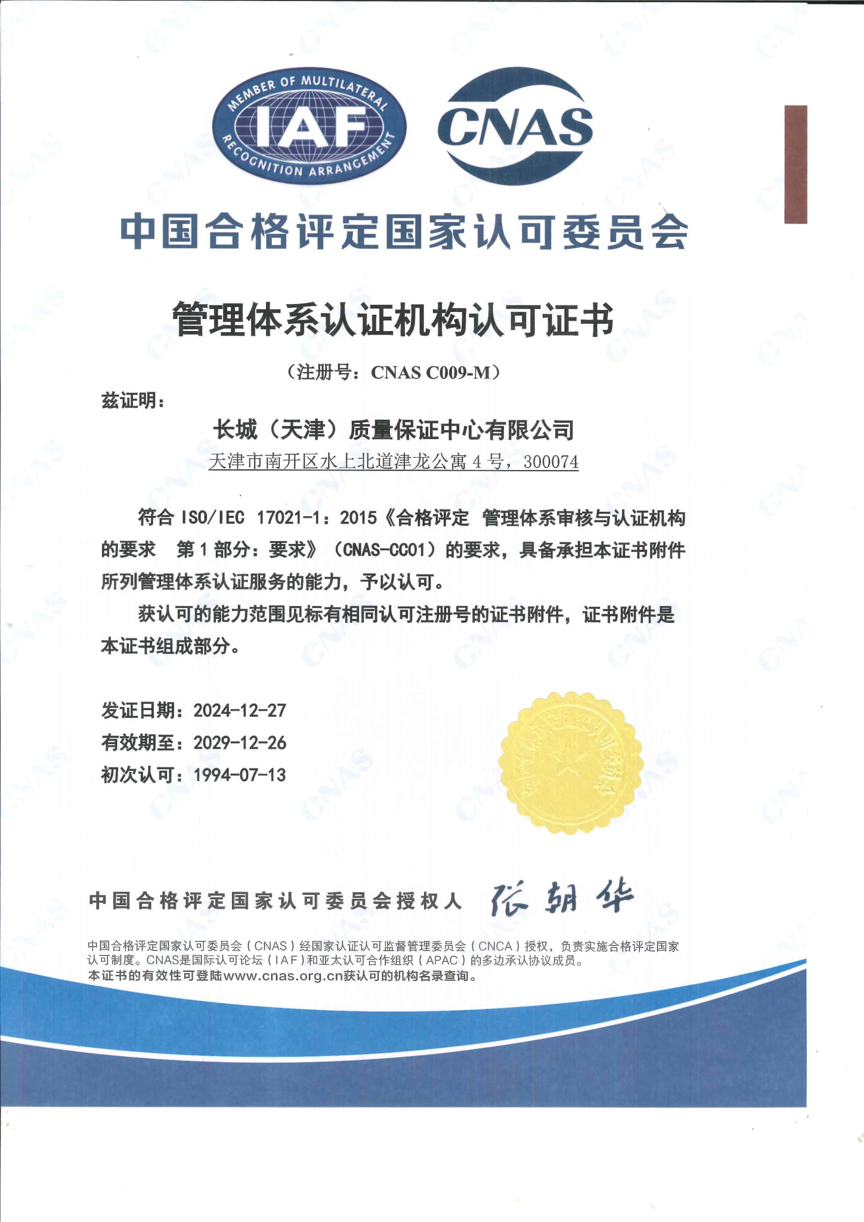 • 長城中心管理體系認(rèn)證機構(gòu)認(rèn)可證書 中文